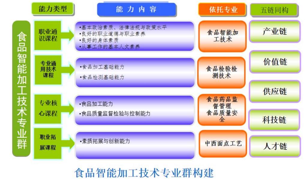 漯河作为首批中国食品名城,食品制造业是漯河市的主导和支柱产业。为加快推动食品制造产业转型升级,2019年,漯河市出台了《关于漯河市中国食品名城建设的实施意见》;2021年,河南省农业农村厅印发了《打通以双汇为骨干的漯河市食品产业链工作方案》,市委市政府要求以集群发展延伸产业链、以创新发展提升价值链、以融合发展打造供应链,探索“三链同构、农食融合”的发展模式。作为地方高职院校有义务主动对接区域经济产业链,发挥自身专业优势,为区域经济的发展服务。结合食品专业与产业链融合发展需要,组建以食品智能加工技术专业为核心专业,辐射食品检验检测技术、食品药品监督管理、食品质量与安全和中西面点工艺等专业的专业集群,专业群涵盖了食品研发、食品智能加工、生产管理、品质管理和产品检验等产业链。