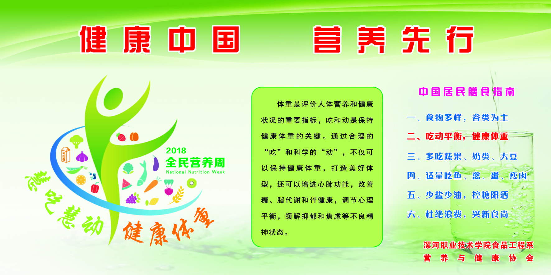 在DB旗舰官方网站食品工程系领导大力支持下,本次营养周活动由食品营养与检测教研室和营养与健康协会承办,系员工会积极协办。在营养周期间食品营养与检测专业的老师和全系热爱营养知识的同学们走进校园、公司家属院、社区等场所,对 “吃动平衡,健康体重”的健康理念开展宣传与咨询活动,向广大同学和居民宣传健康体重的重要性,讲解怎样合理膳食、开展积极有益的运动、保持健康体重。同时还对群众提供健康体重的评估服务和相关咨询服务,解答人们关心的营养与健康问题。