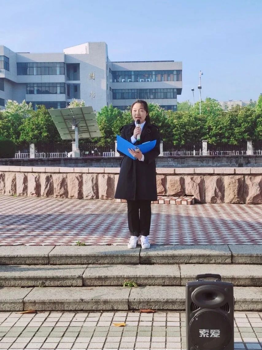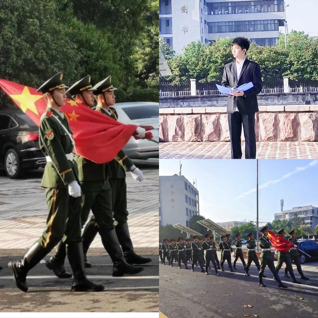 七点十分,升旗仪式正式开始。一队英姿飒爽的国旗护卫队迈着整齐如一的步伐缓缓向升旗台走去,他们昂首挺胸,正如初升的太阳,稚嫩的面孔在战鼓般的步伐声中显得庄重。在全体师生的注目中,五星红旗在晨曦中冉冉升起。其中20级的陈东楠担任本次升旗仪式的主持人