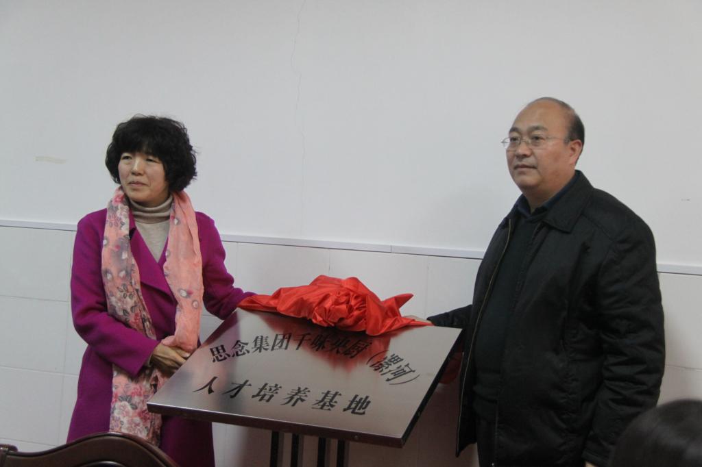 吴玉堂分别和陈瑞华、刘庆伟、苏玉霞在学徒制培养合作协议上签字并分别为郑州市仟吉食品(漯河)烘焙公司、思念集团千味食品(漯河)人才培养基地和天瑞集团(漯河)营养与健康管理公司揭牌。