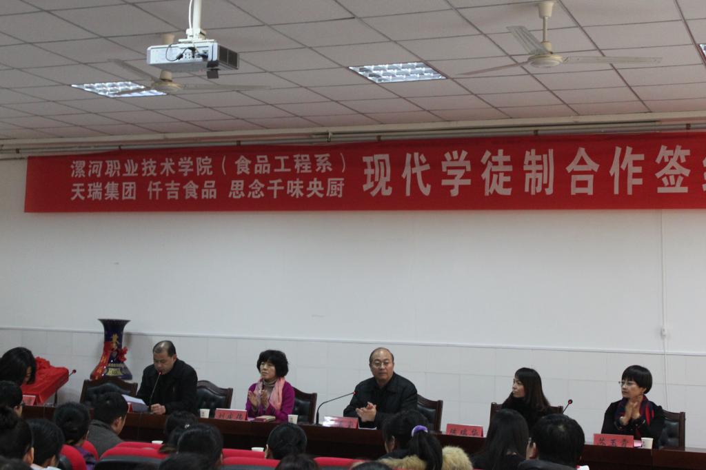 公司作为100所全国现代学徒制试点院校之一,公司领导高度重视项目建设工作。今年以来,食品工程系根据教育部《现代学徒制工作实施方案》和食品工程系《现代学徒制试点工作任务书》的要求,积极寻求合作伙伴,最终确定与思念集团郑州千味央厨食品有限公司、郑州市仟吉食品有限公司和济南天瑞健康信息咨询有限公司三家单位进行学徒制合作。并经校企双方多次沟通研讨,将合作方提供的6-10门岗位课程纳入人才培养方案,培养方案框架已经形成,实现了课程改革的新突破;探索构建了“六段四双一体化育人”人才培养模式(六段即学徒1、2、4学期在公司,3、5、6学期在企业,四双即校企双主体育人、学徒双重身份、双导师队伍、双课程设置,一体化育人即合作双方建立与现代学徒制相适应的协商联动、合作培养、责任共担、资源共享、互聘共用、三方共赢的一体化运行机制),经双方共同动员、按照员工自愿的原则,分别有104名员工加入了2015级仟吉食品、2015级千味央厨、2015级知心天瑞、2016级仟吉食品、2016级千味央厨等五个学徒制班,实现了培养模式的新跨越;共同成立了思念集团千味食品(漯河)人才培养基地、郑州仟吉食品(漯河)烘焙公司、天瑞集团(漯河)营养与健康管理公司,并由王变奇副经理担任经理或主任,由合作方副总裁任常务副经理或副主任,搭建了校企合作管理的新平台。