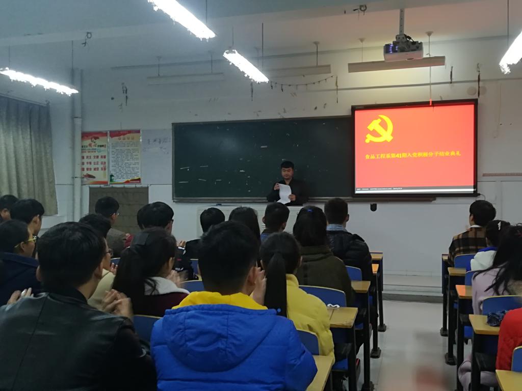 11月17日中共DB旗舰官方网站食品工程系党总支在3号楼404教室隆重举行了DB旗舰官方网站食品工程系第41期入党积极分子结业典礼,食品工程系党总支书记叶桂娥、员工党支部书记王文甫、员工党支部纪检委员韩磊出席本次典礼。