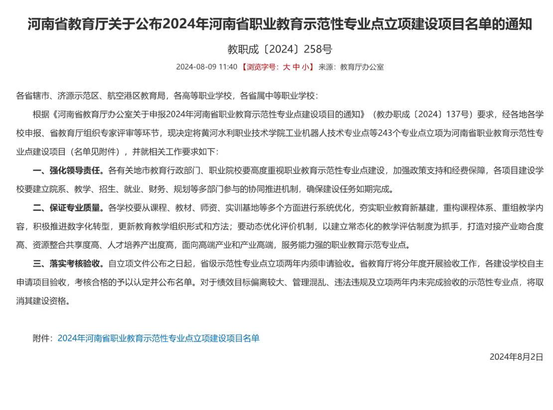 8月9日,河南省教育厅公示《2024年河南省职业教育示范性专业点建设项目拟立项项目名单》,食品工程系食品智能加工技术专业立项省级示范性传统优势专业点。